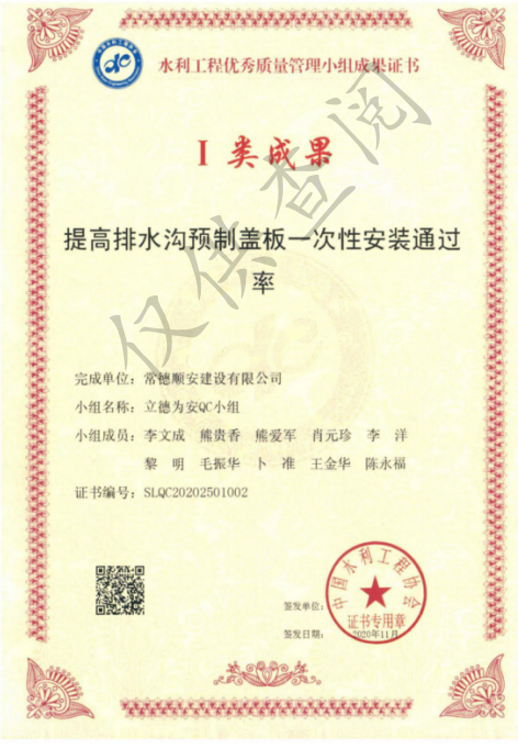 水利工程優(yōu)秀質(zhì)量管理小組成果證書